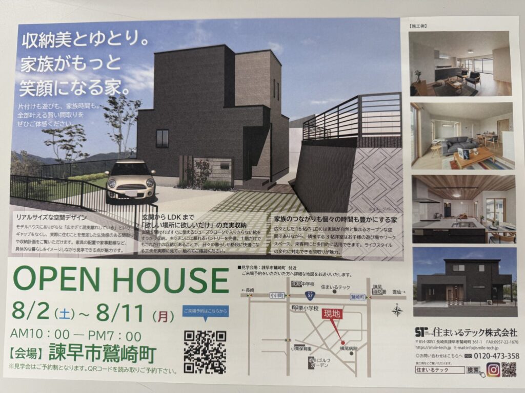 展示会 完成見学会案内 2025.08.07 こんにちは。森です。 完成見学会案内を諫早市鷲崎町にて8月11日まで開催しております。 閑静な住宅地で家事動線が良い間取りの家です。是非ご覧下さいませ。 投稿者: 住まいるテック株式会社 展示会 夏越まつり 前の記事 松浦へ行ってきました。 次の記事