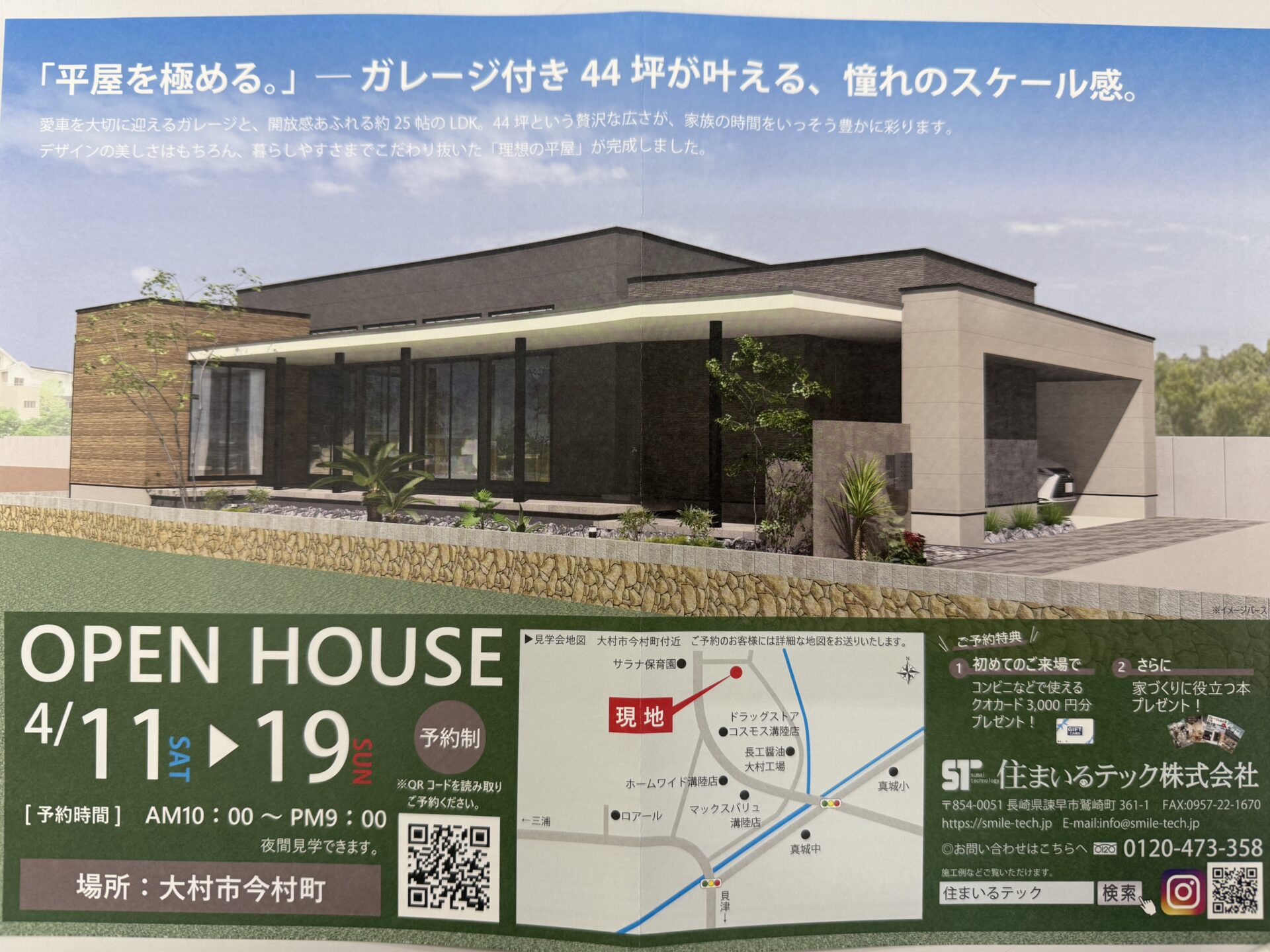 展示会 展示会 2026.04.02 こんにちは。森です。桜が咲いて春らしい季節となりました。 4月の完成見学会のおしらせです。大村市今村町にて4月11日から4月19日。 ガレージ付きの平屋・リビングが25帖と広々としてます。 スタイリッシュな外観デザインと広々な空間を是非ご覧下さいませ。 ご来場お待ちしております。 投稿者: 住まいるテック株式会社 展示会 美肌シャワーヘッド 前の記事 小野町アパート 次の記事