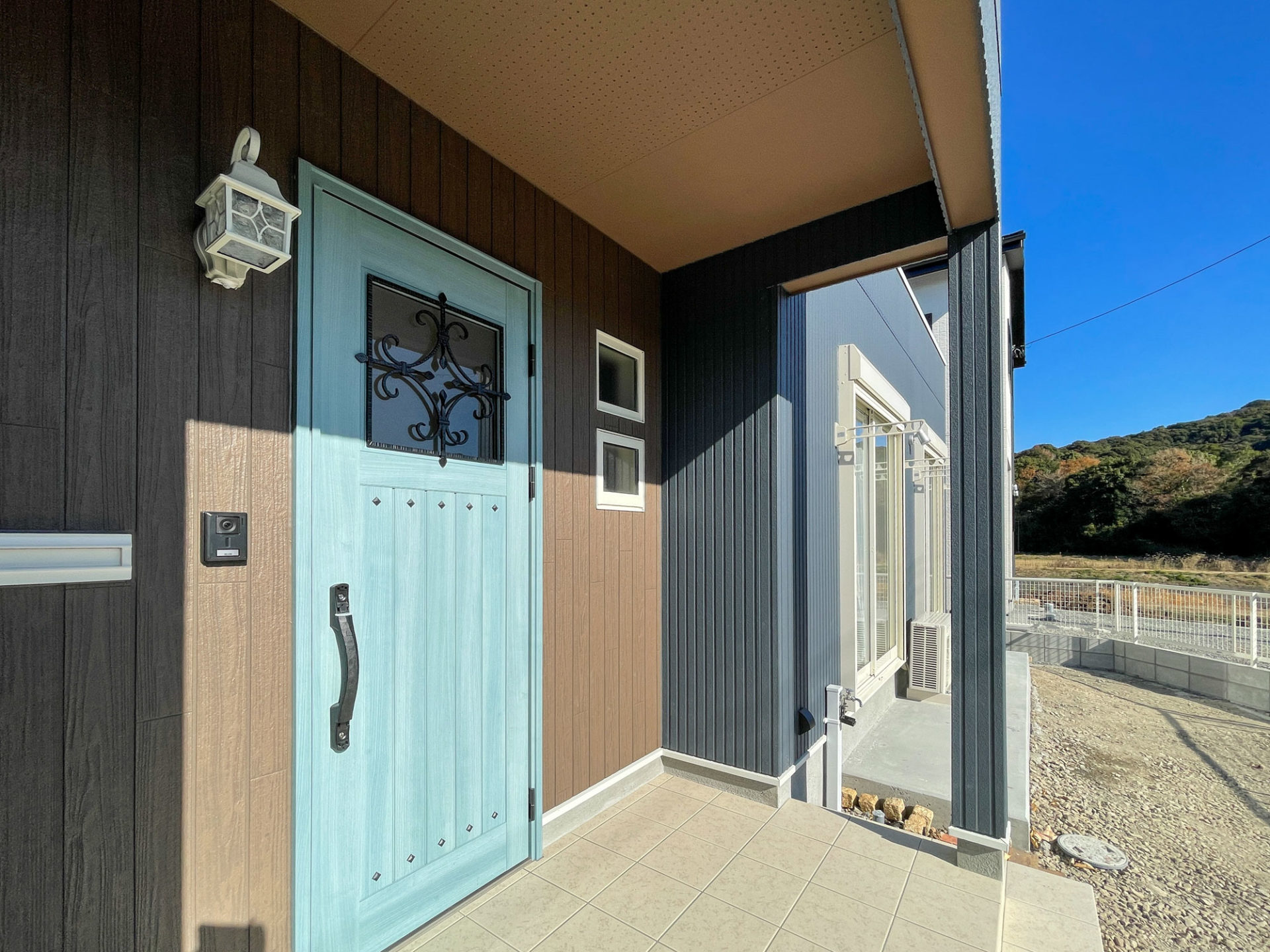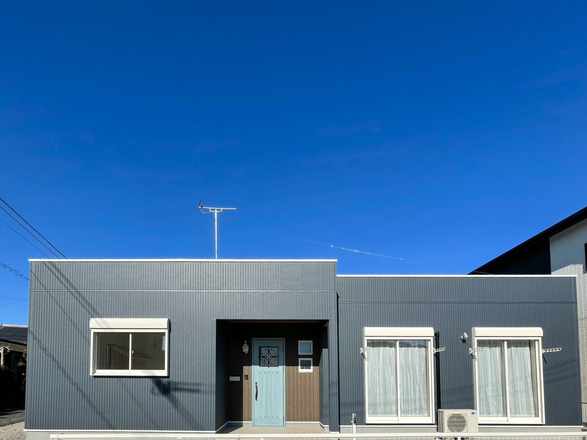 キューブ型のスタイリッシュな平屋。青の外壁にアイスブルーノーチェのドアが映えます。