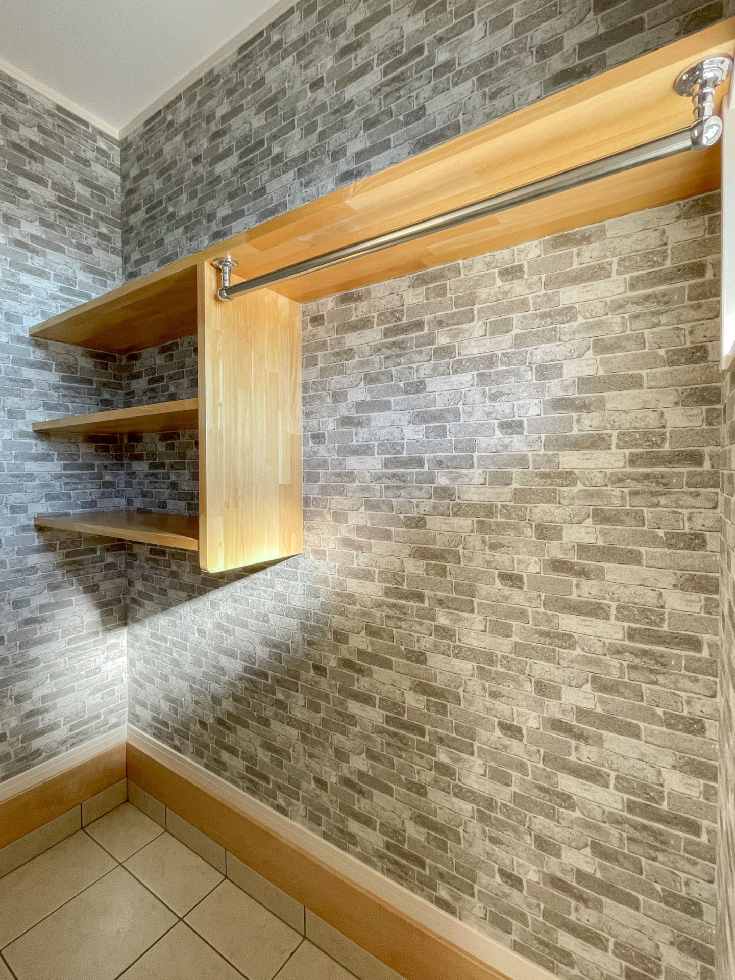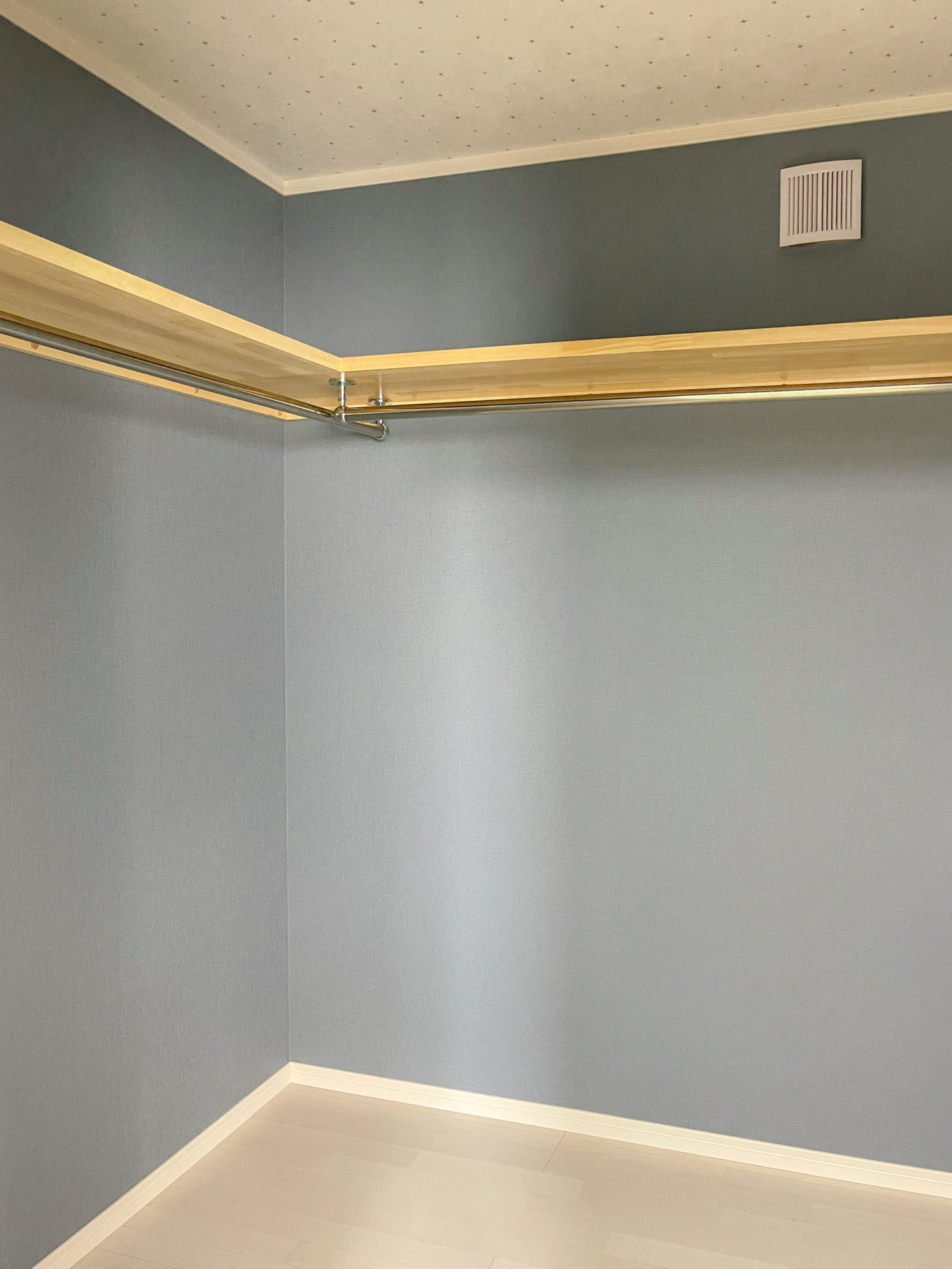 寝室のクローゼット。天井にも模様の入ったクロスと、衣類も収納できるようハンガーパイプを施工しました。