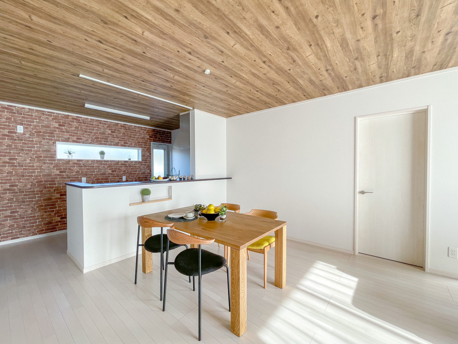 18畳のLDK。レンガ調クロスをアクセントにカフェ風に仕上がりました。