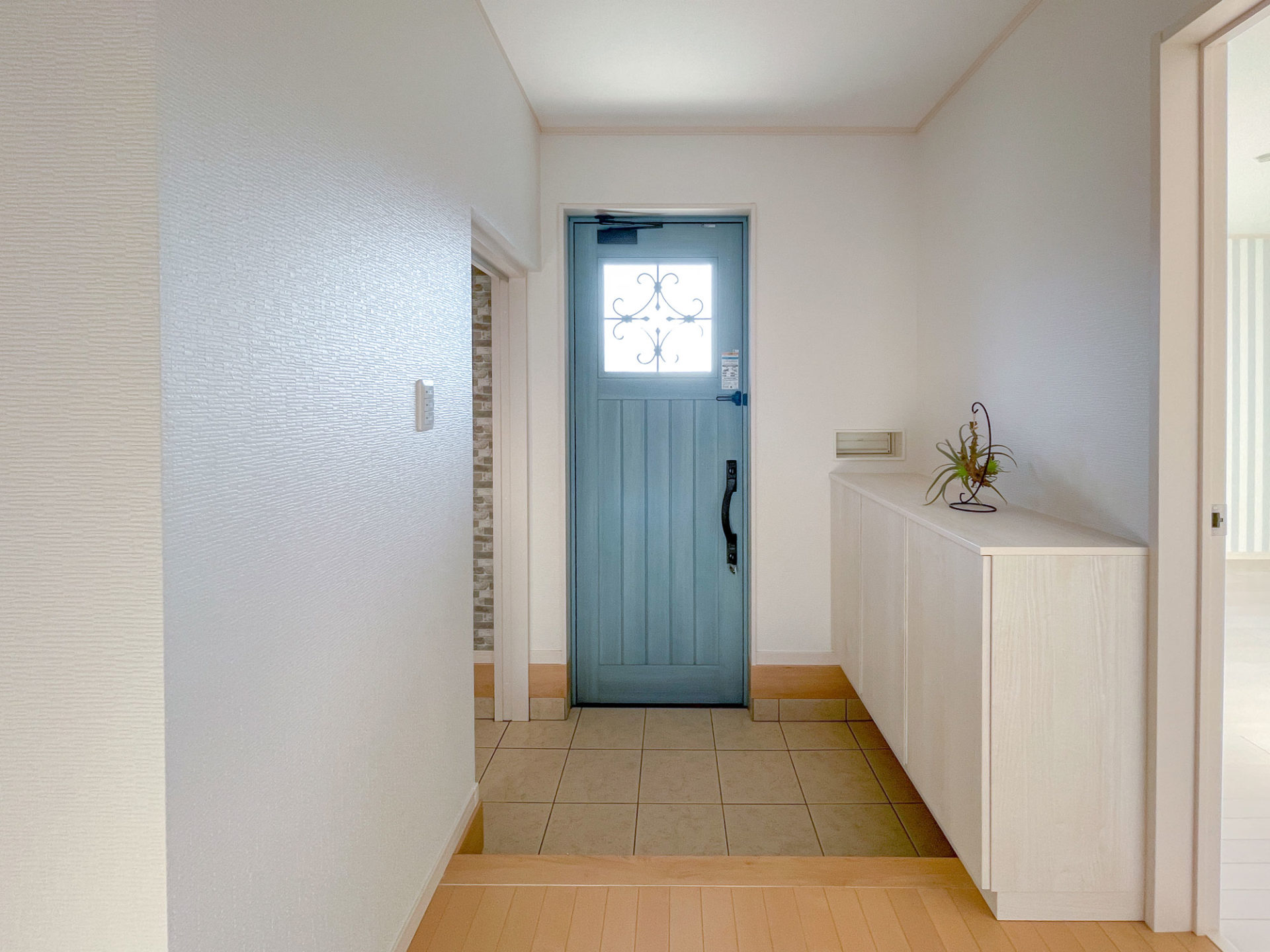 中から見た玄関。さわやかなドアは外出時にも気分が上がりますね。