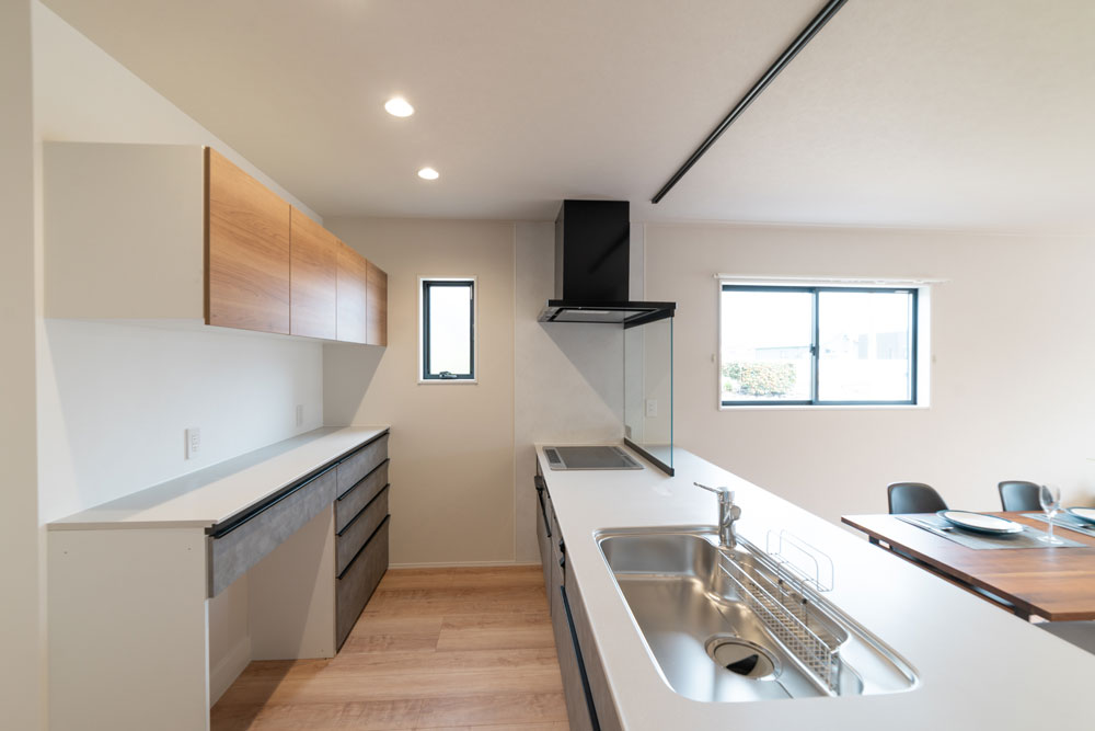 モダンなデザインと温かい木目の調和が美しいキッチン。
