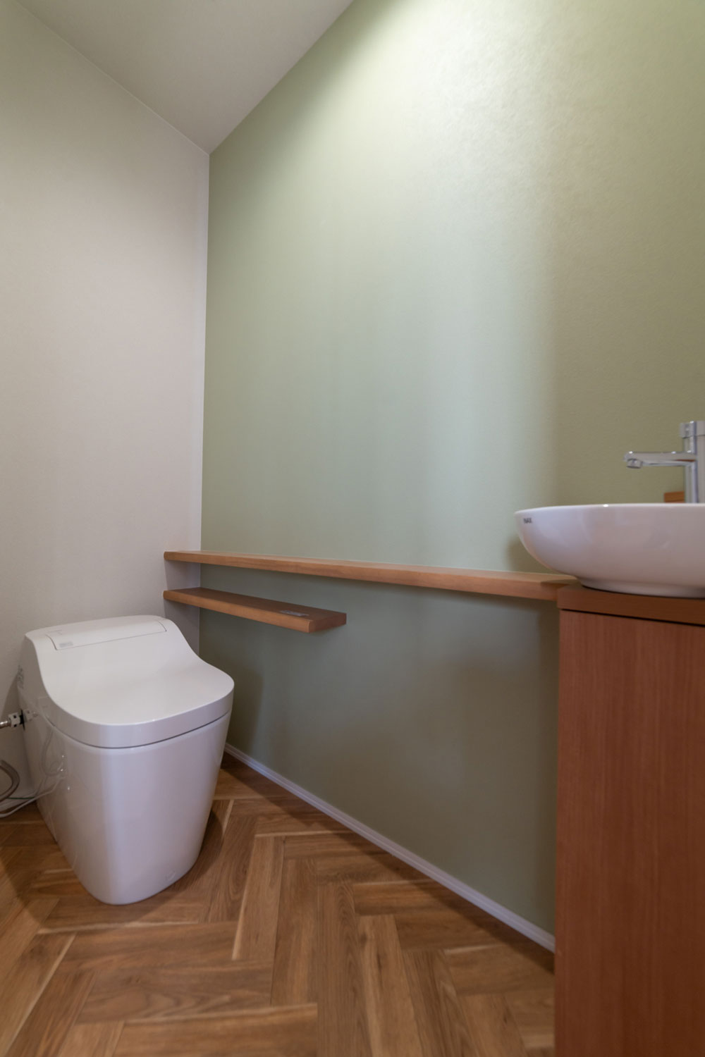 白と木目を基調とした清潔感あふれる脱衣室。