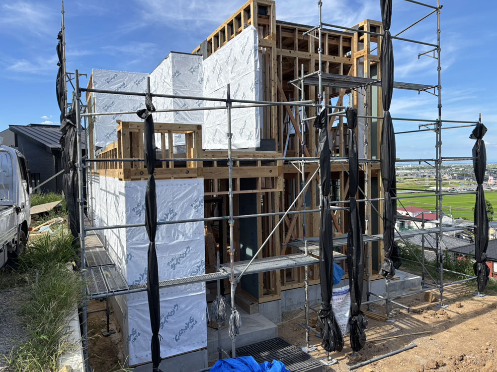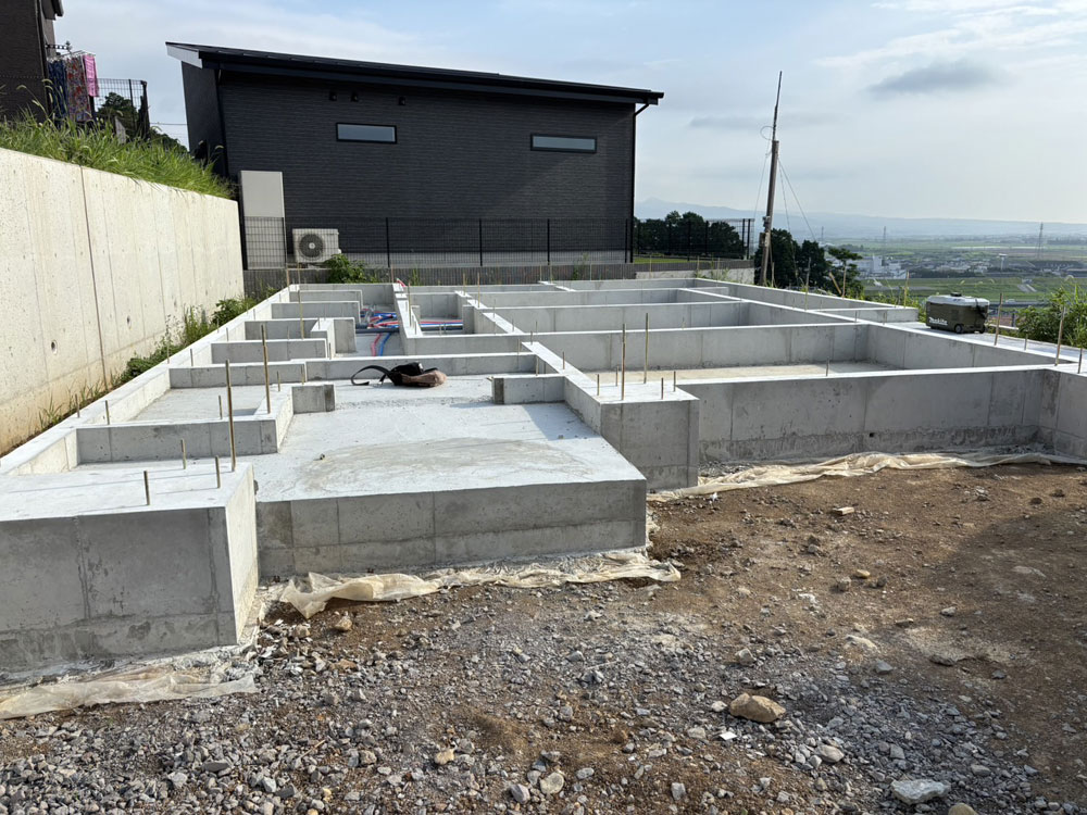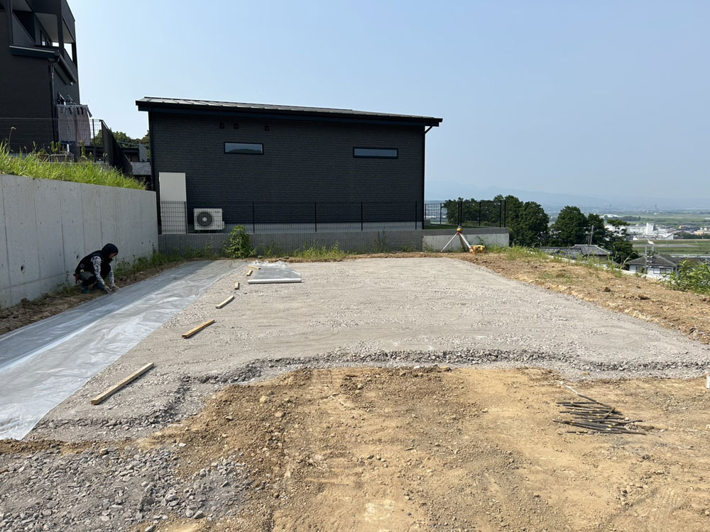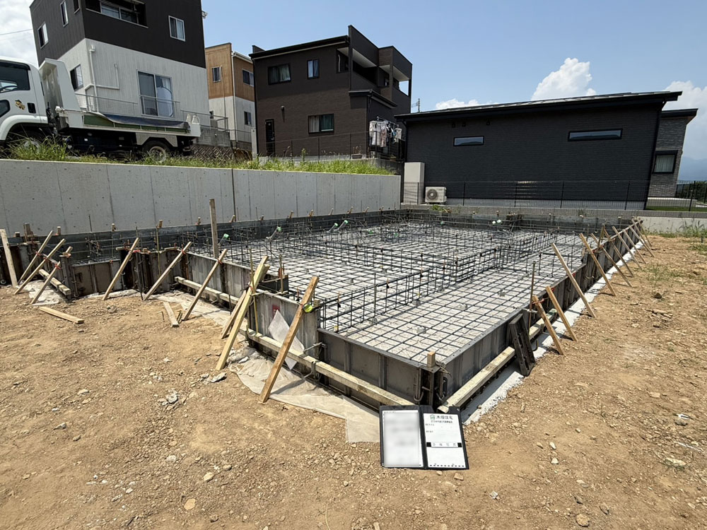 【完成】諫早市鷲崎町M様邸 STEP イメージパース STEP 基礎工事 地盤をならしました。 STEP 基礎工事 基礎配筋が終わり、これから配筋検査を受けます。 STEP 基礎工事 基礎が完成しました。 STEP 大工工事 構造材を立ち上げました。 STEP 大工工事 透湿防水シートを貼り始めました。 STEP 大工工事 サッシの取り付けが終わりました。 STEP ウレタン吹付工事 ウレタンの断熱材吹き付けが終わりました。 STEP 内部工事 石膏ボードを張っています。 STEP 内装工事 クロスを貼り終えました。 STEP 完成 モダンで洗練された、開放感あふれるLDK。 STEP キッチン ダークグレーで統一感のあるスタイリッシュなキッチン。 STEP ただいま手洗い 玄関から生活空間に入る前に手を洗える洗面台。 STEP 洗面カウンター ホテルライクなデザインの洗面カウンター。 STEP 洋室1 グレイッシュなフローリングでシンプルモダンな洋室。 STEP 洋室2 温かみのあるナチュラルな洋室。 STEP 洋室3 オールホワイトで広々と感じられる空間。 過去一覧 前の記事 次の記事