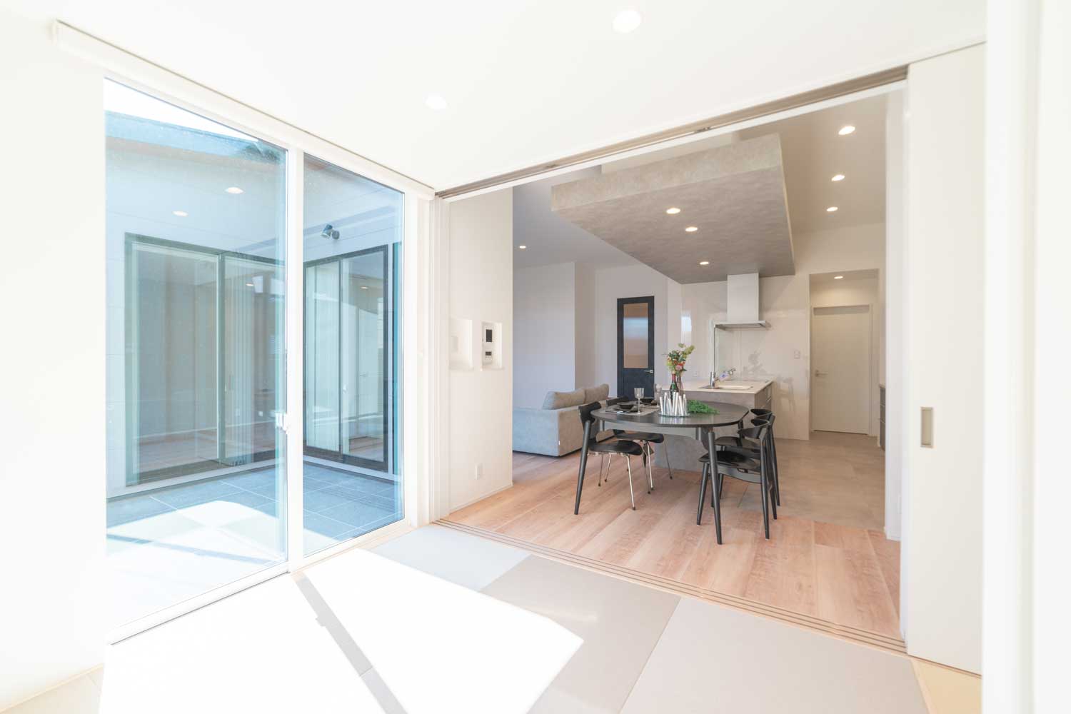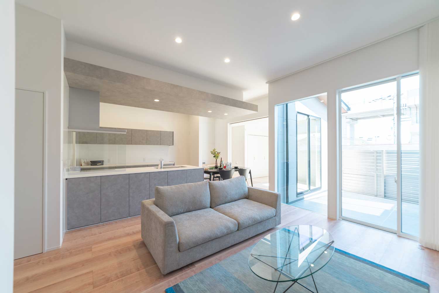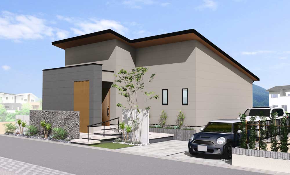 【平屋】リビングを中心に家族が快適に暮らせる平屋 イメージパース 木目ルーバーが印象的な玄関、約20帖のLDK、そして多用途に使える和室。収納も充実し、暮らしやすさ抜群の住まいに。 さらに、3つの部屋からつながるタイルデッキの中庭は、家族のみんなの憩いの場に。 お子様の遊び場やリラックス空間としても大活躍します。 資料請求はこちらから 片流れ屋根とシャープなラインがつくるモダンで洗練された外観。 ナチュラルモダンなリビング。テラスはプライバシーを保ちつつ光と風を近くに感じる空間に。 キッチンからリビング全体の様子が伺えます。 寝室には収納も完備。扉がないぶん奥行きを感じられ、通気性もよく荷物の出し入れもしやすい。 資料請求はこちらから 過去一覧 前の記事 次の記事