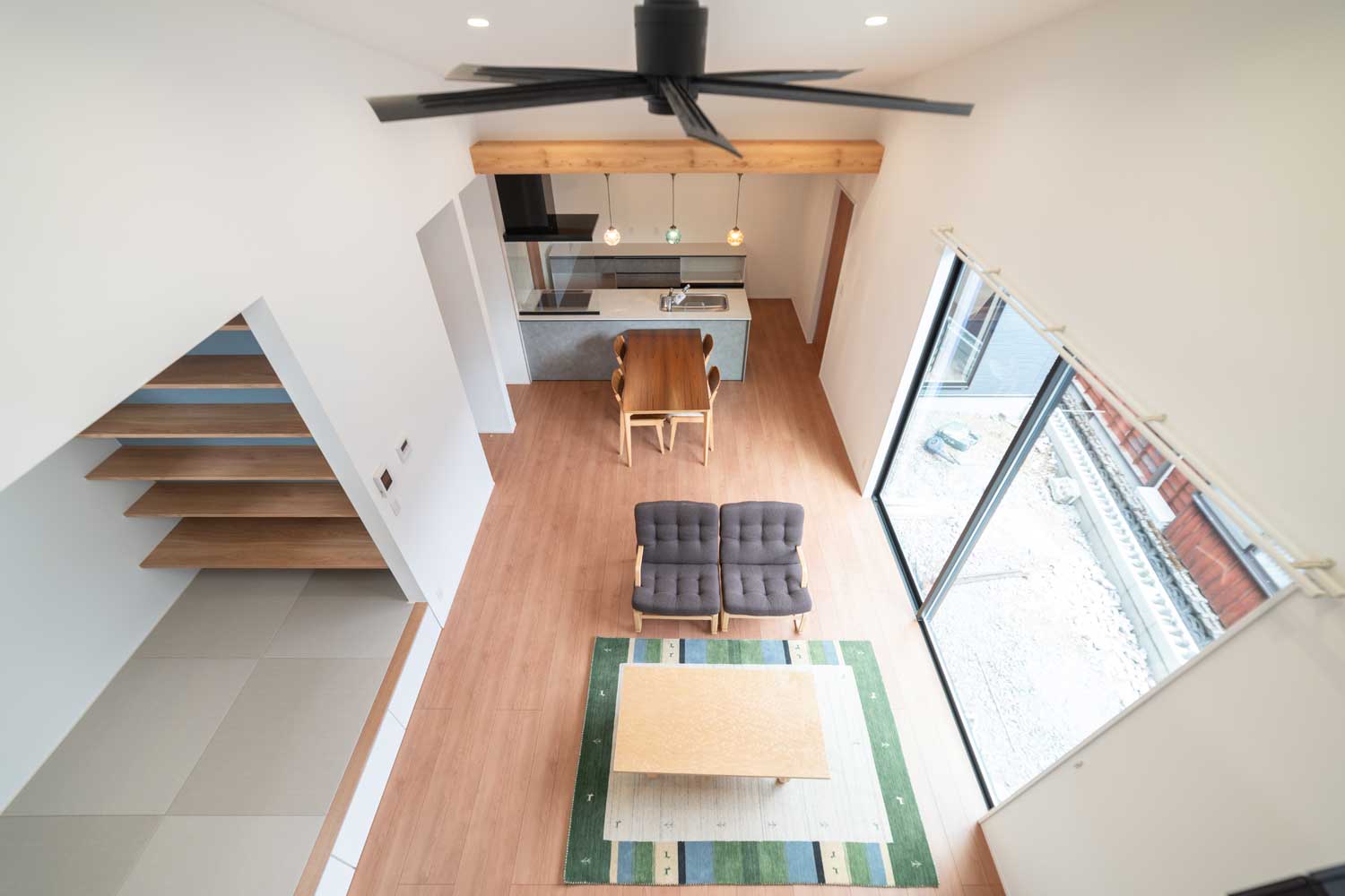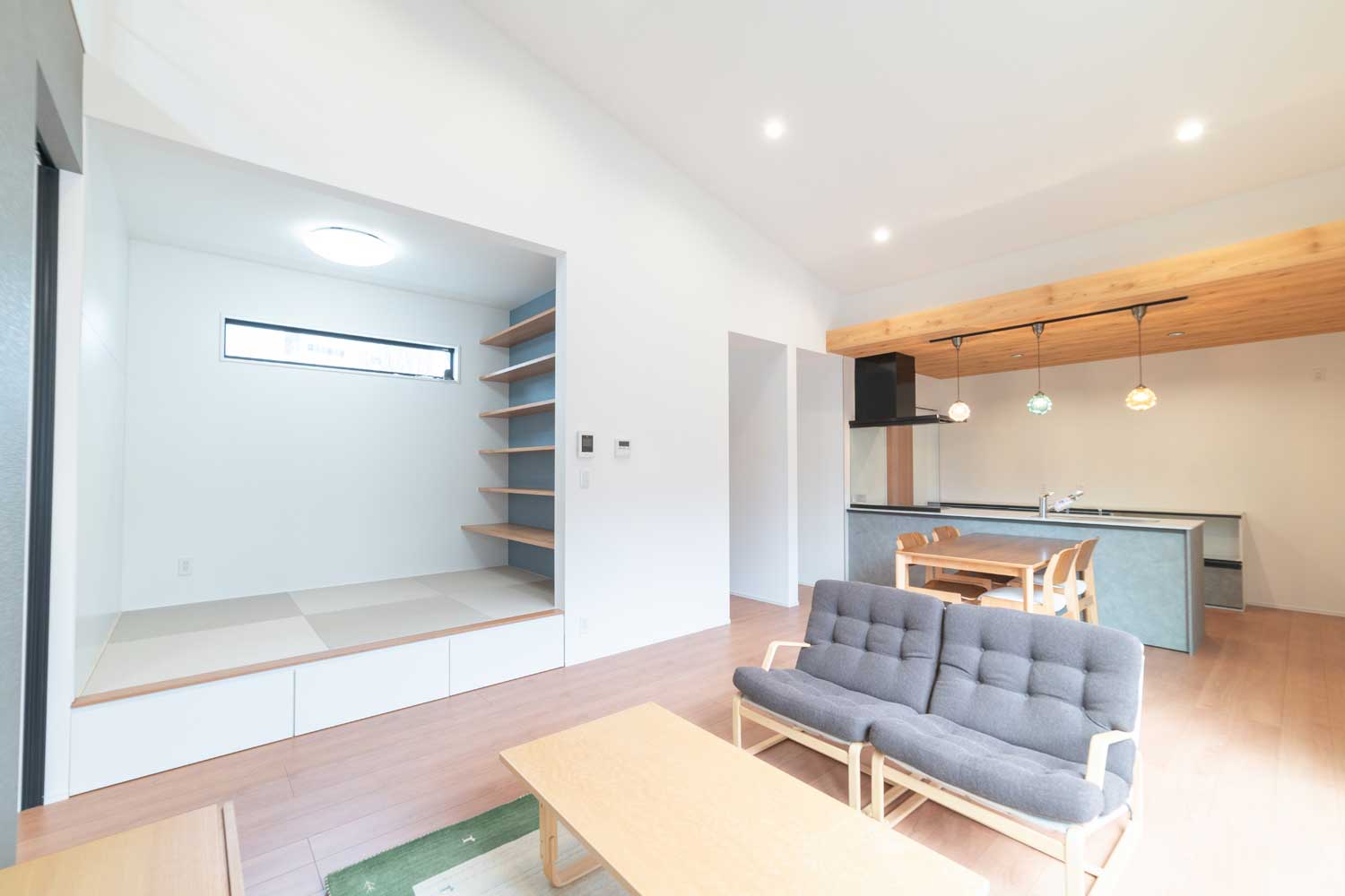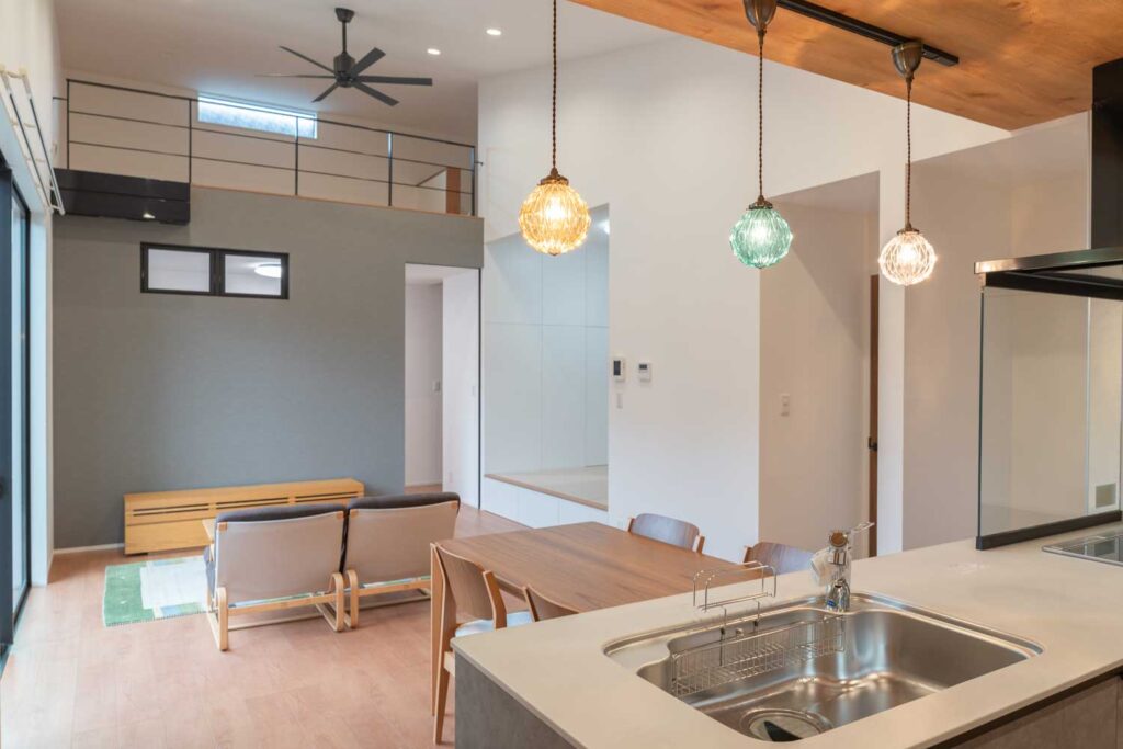 開放感あふれる勾配天井のLDKに、吹き抜けのロフトと小上がりの畳スペース。家族の気配を感じながらそれぞれの時間も大切にできる住まいです。