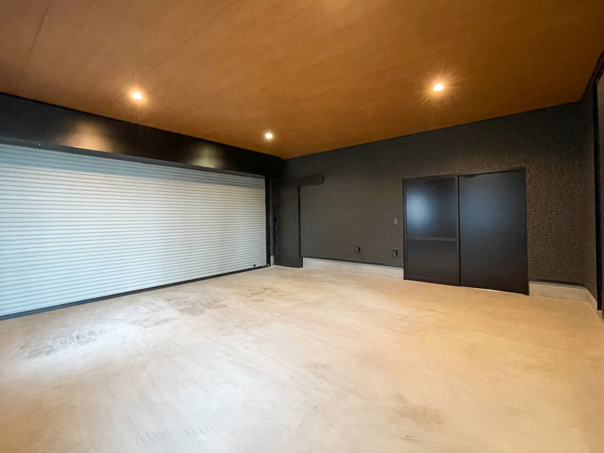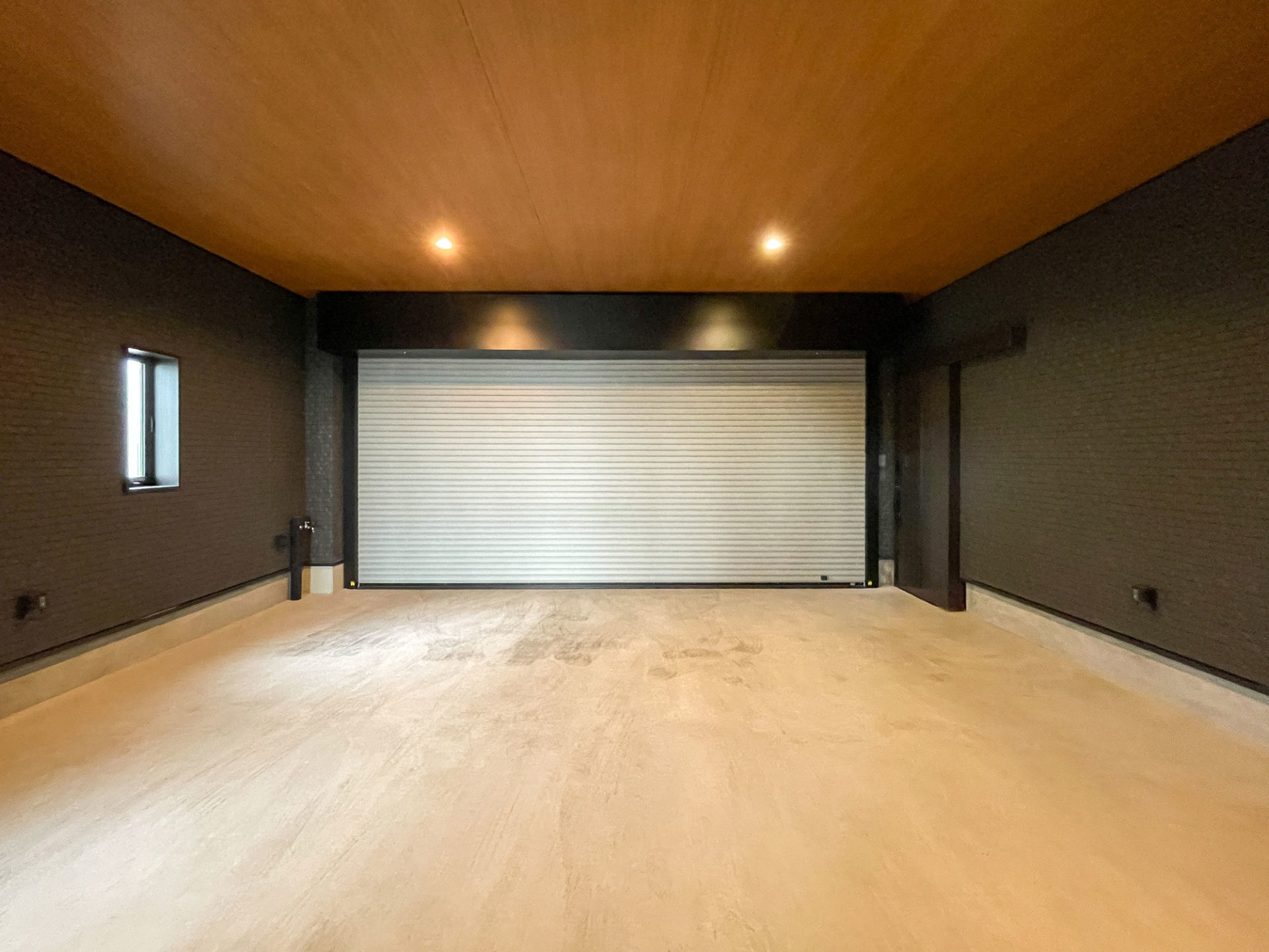 シャッター付きの広々したガレージは天井を木目調にしました。シックながらも温もりのある空間に。