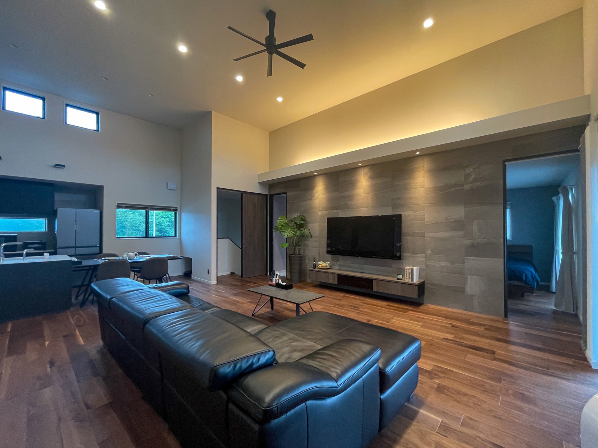 高天井の広々とした開放的な空間にもたらされたLDK。垂れ壁には間接照明を設置しました。