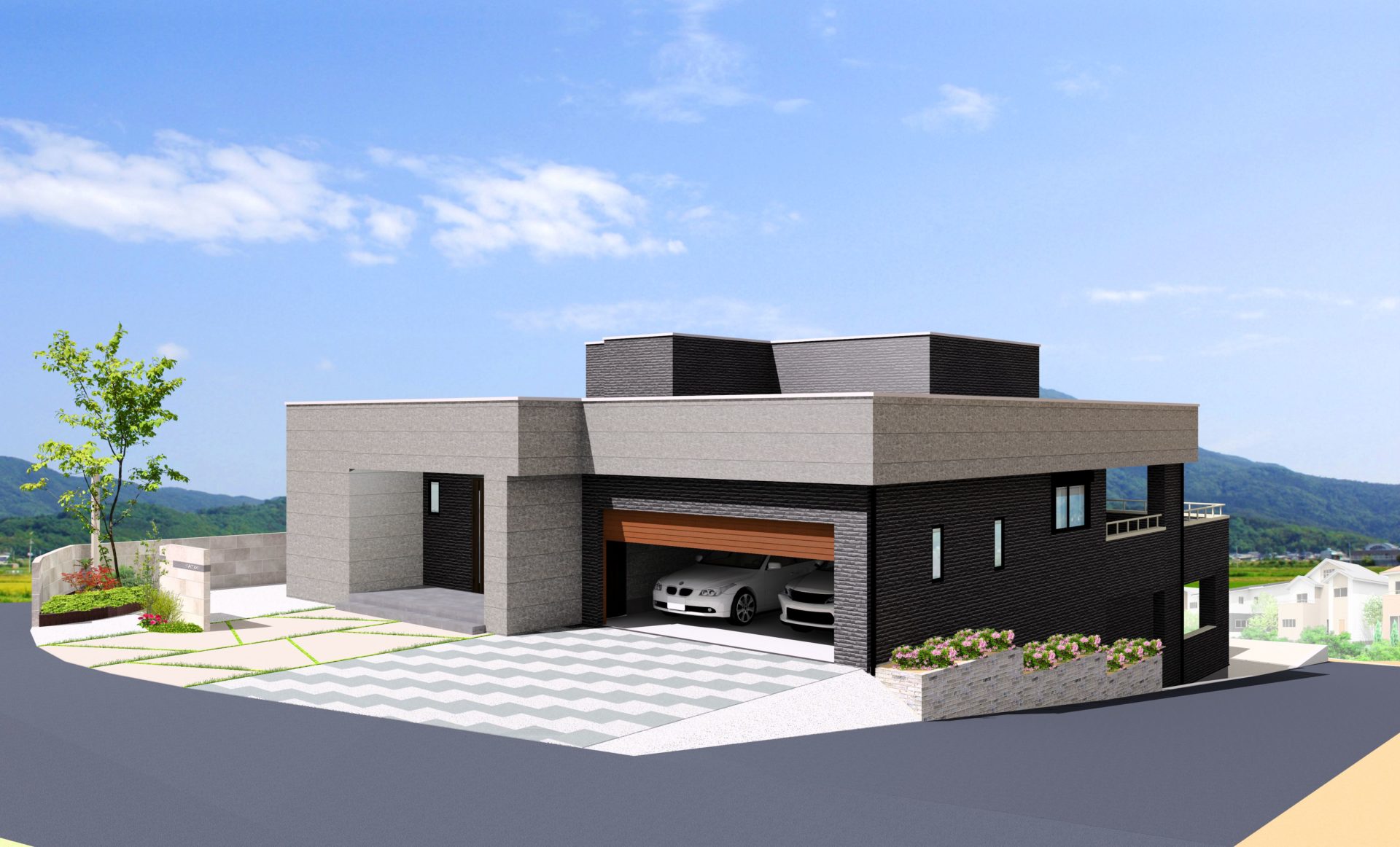 平坦な土地よりも採光性が高く、展望の良い空間にメリハリのある家となりました。見る方向によって外観の印象が変わるなど面白い外観です。外壁には重厚感のある石目調を使用し、モダンに仕上げました。