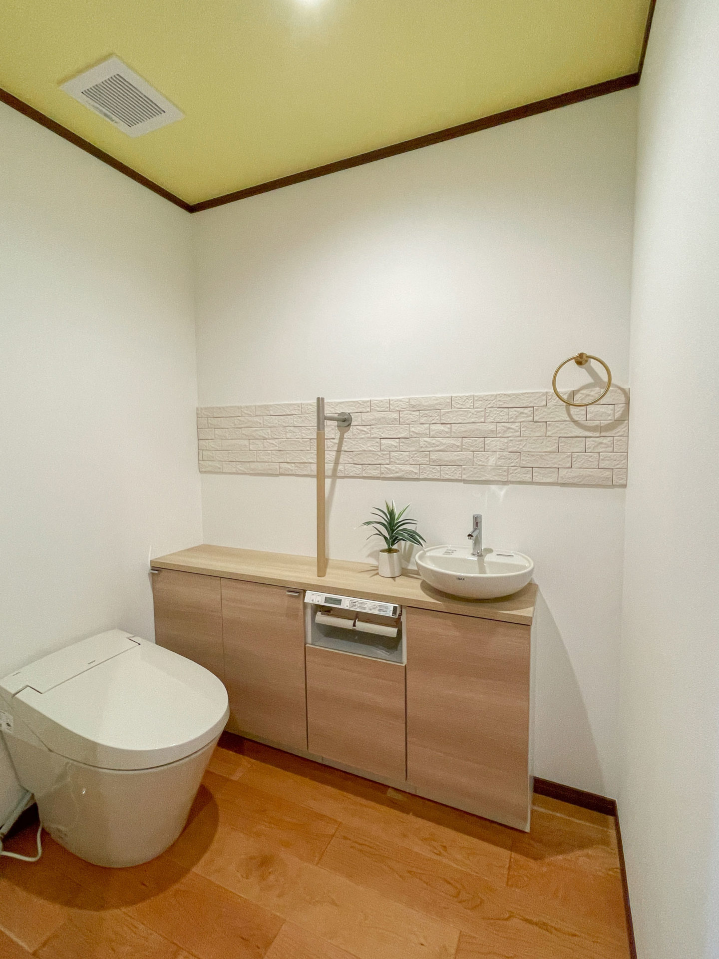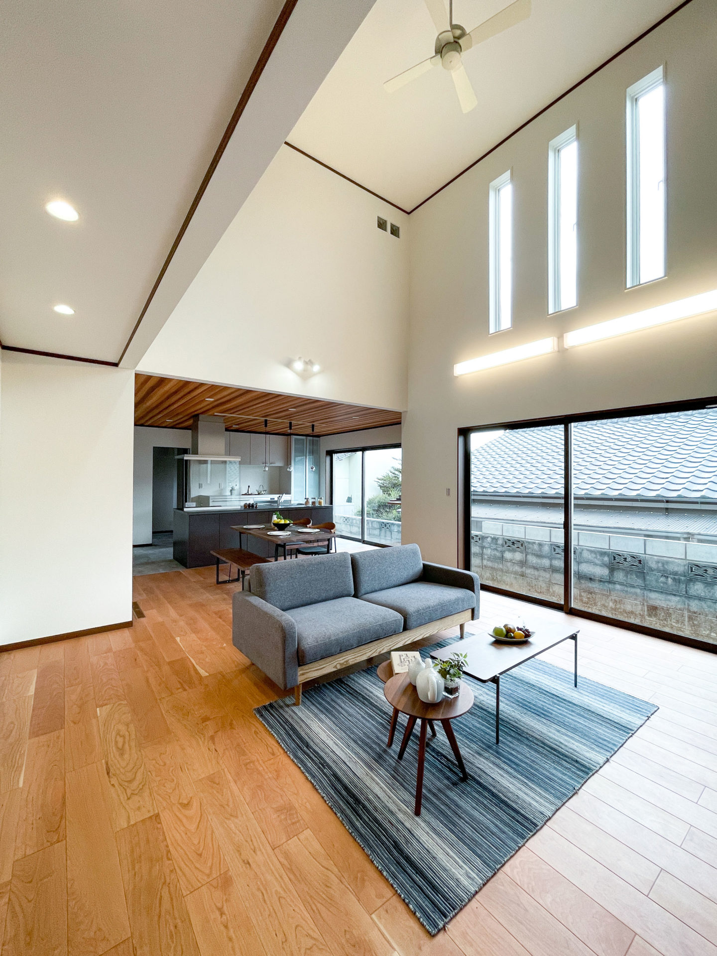 高い位置に窓を設け、光が差し込むLDK。天井にはシーリングファンを設け、お部屋の空気を循環させます。