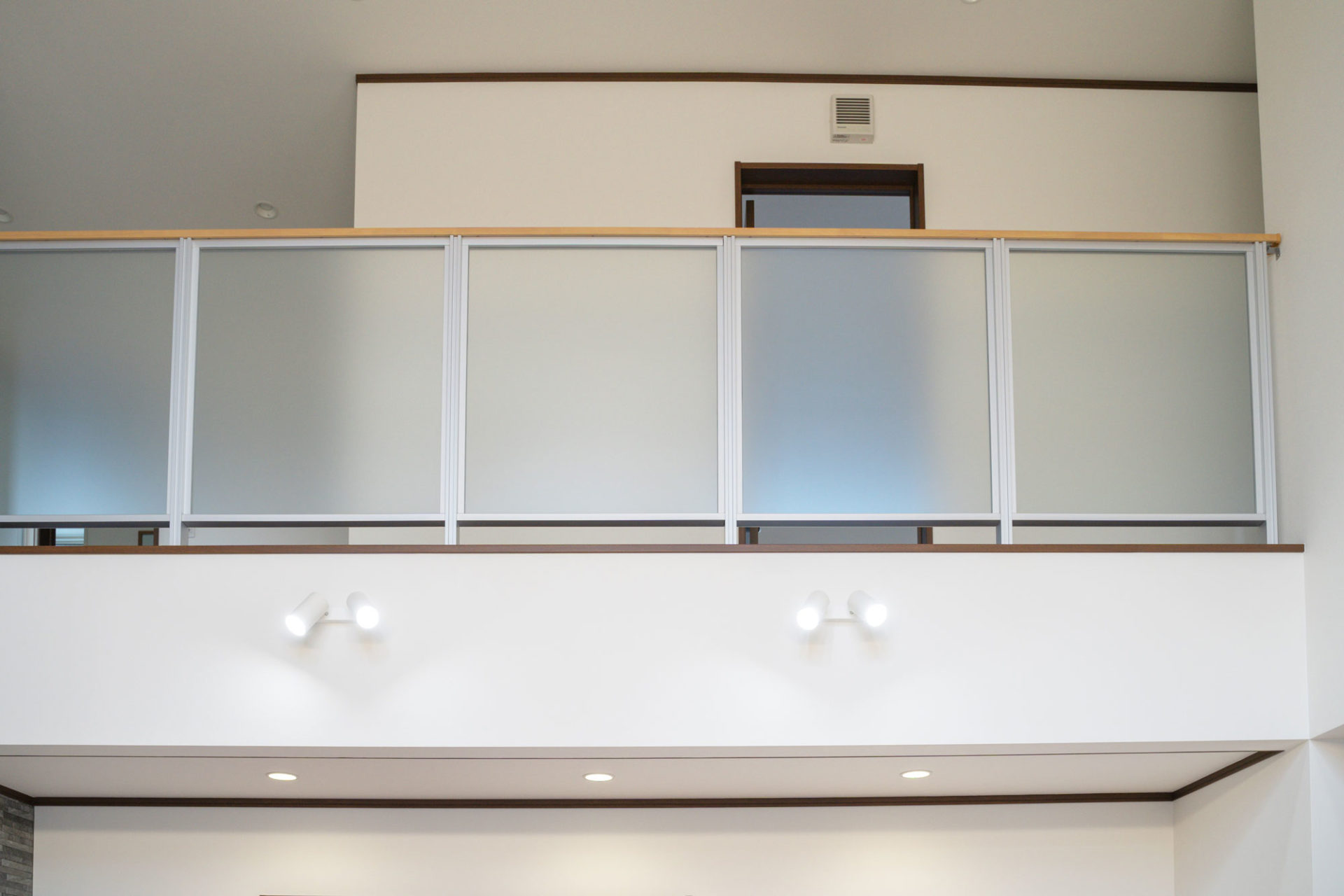 開放感を損なわぬよう、吹き抜け空間の手すりはパネル式にしました。